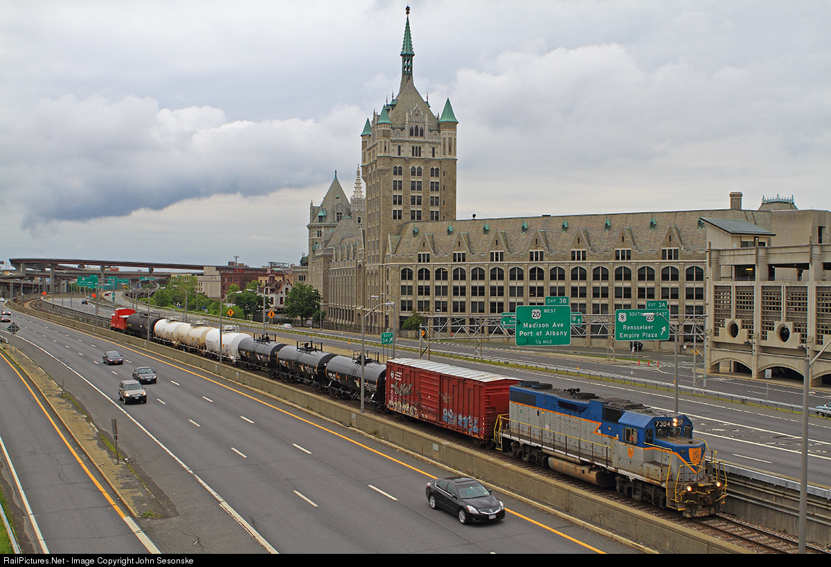 | One of the last 2 D&H lightning stripe units rolls NB past the historic D&H Building in downtown Albany. DH 7304 has an 8 car local with a shoving platform and has just departed Kenwood Yard to work Surpass Chemical and Global Propane on its way to Colonie Yard. The original D&H Building was completed in 1915 and served as headquarters for the Delaware & Hudson Railway until the late 1970's. The whole section south (left) of the main tower was built as an add on and completed in 1918. The far south tower was built to house the Albany Evening Journal. The tracks are surrounded by the NB and SB lanes of I-787 and because the tracks are contained in a concrete walled trench this section of track is known as the Concrete Canyon. |