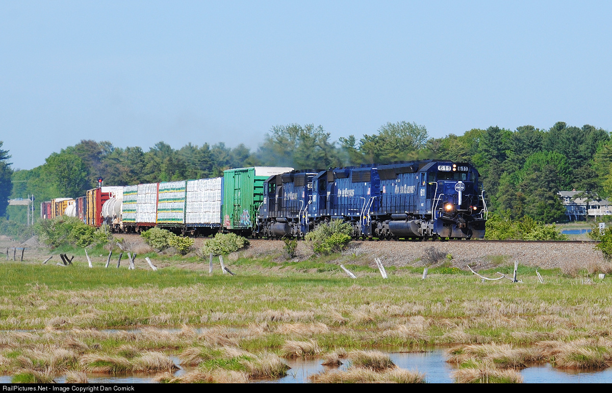 | With a recently added white stripe down the nose, MEC 611 leads POED west through the Scarborough Marsh on a beautiful spring afternoon. |