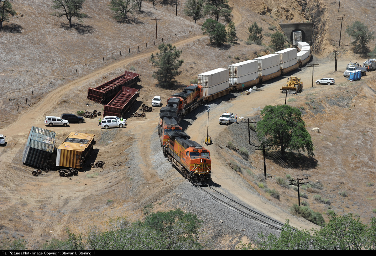 First train to go through the derailment on the Tehachapi Loop on May 21, 2014. Just up the hill in front of BNSF 5130 are the remains of loaded autoracks which have been moved off the mainline.