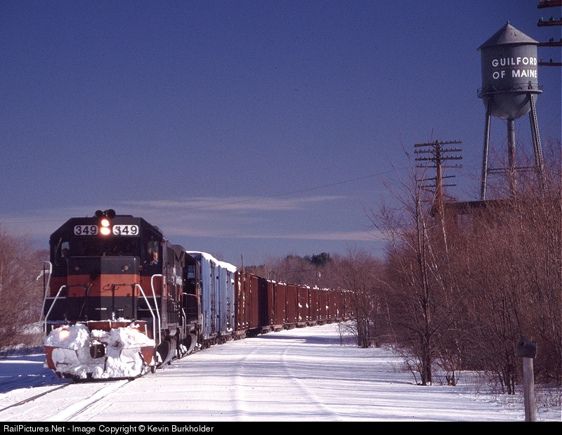 On December 9, 2003, following a few days of snowy Maine weather, Guilford Rail System train NMPO-09 rolls past the Guilford of Maine (no relation) plant in Newport, Maine. The NMPO was powered by GP40s 349 and 330 and totes a hefty cut of logs up front.