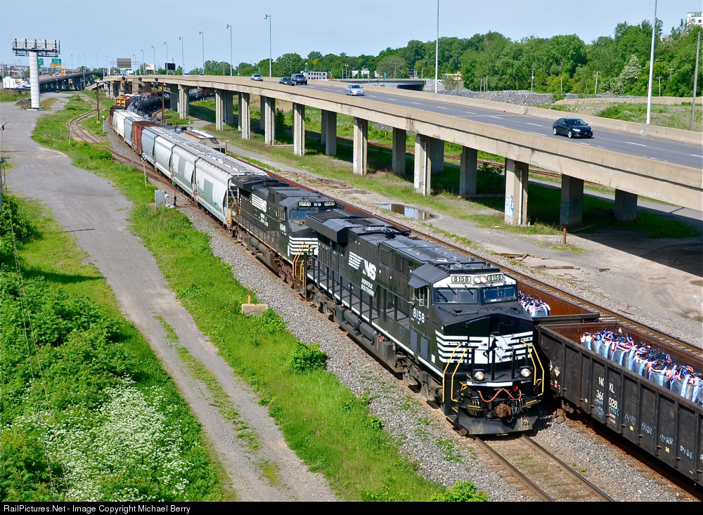 | A very late CN 528 heads east on a beautiful morning with NS 8158 and NS 8948 leading. At right is CN 305 which has just come to a stop to change crews at Turcot West. At right are the eastbound lanes of highway 20. |