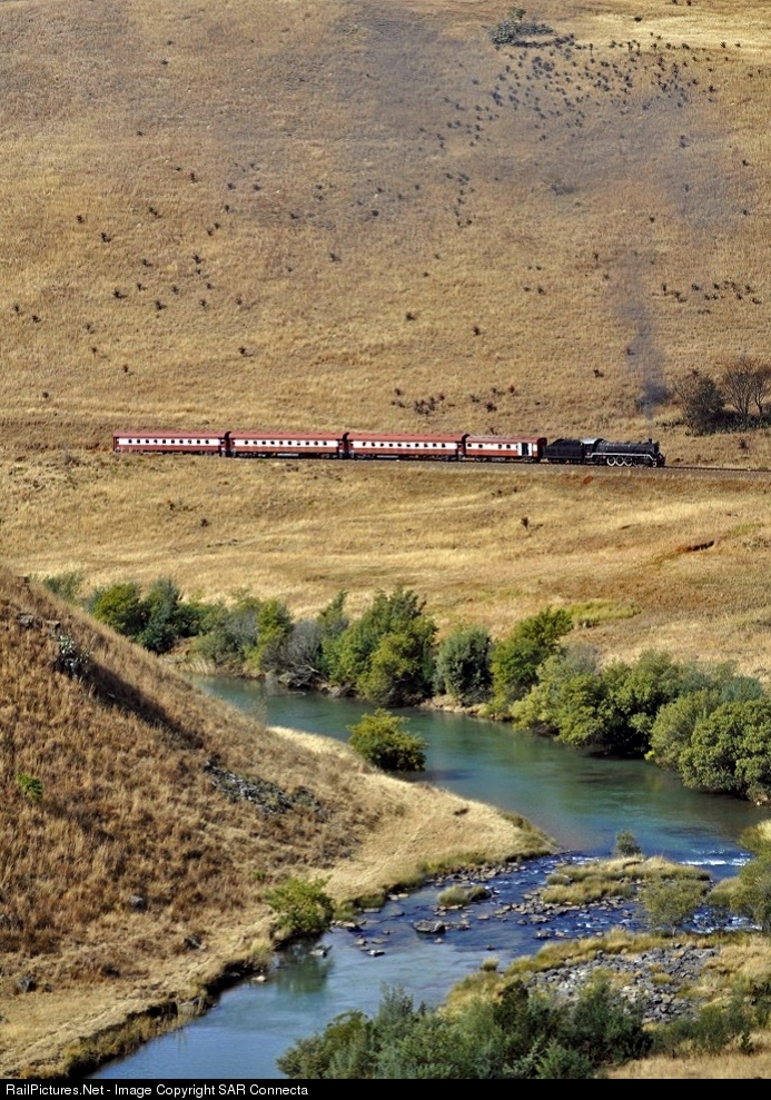| The Ngogwaan River flows peacefully on a chilly winter afternoon and ex South African Railway Class 19D (4-8-2), No. 2669, on loan to the Creighton / Ingwe Municipality from THF (Transnet Heritage Foundation), is on her way to Riverside Station from Creighton with her afternoon working at the 2011 Aloe Festival. |