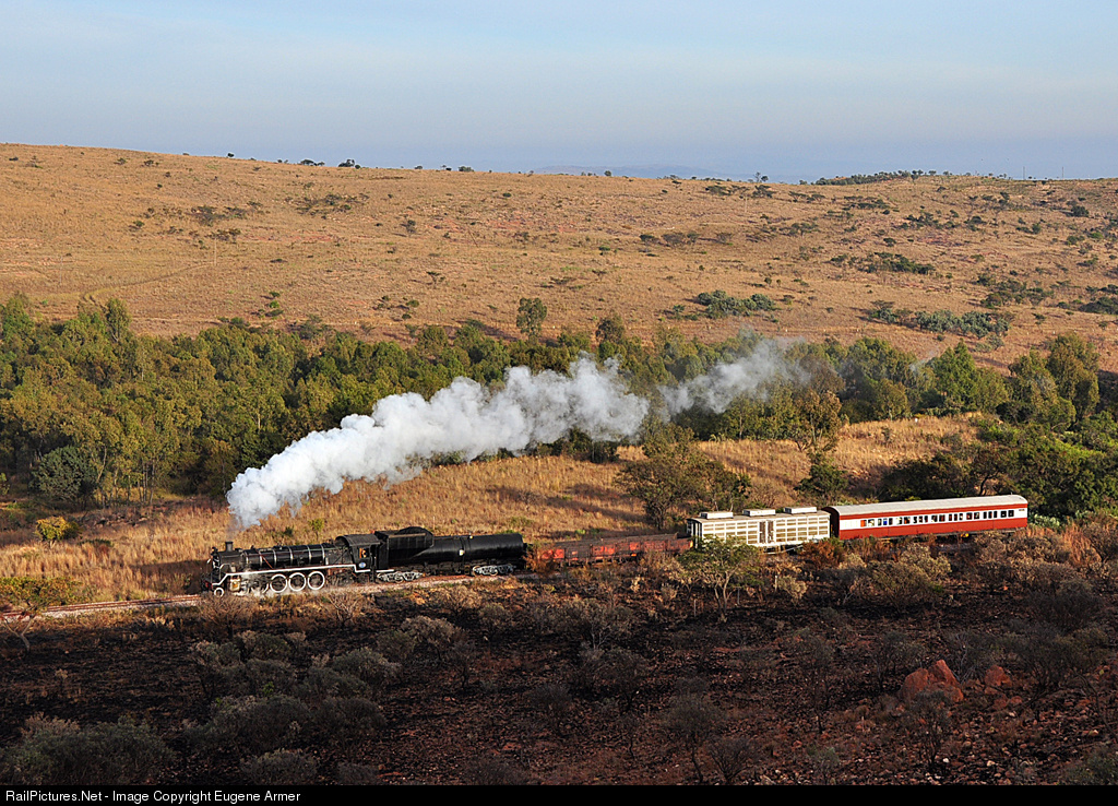 | Friends of the Rail's class 19D 4-8-2 is hauling a short mixed train south of Cullinan, recreating a scene that would have been seen regularly on various branch lines around South Africa 40 or 50 years ago. The empty type DZ wagon may have brought farming equipment to the village, the silver milk wagon would have carried milk from the farms to the nearest town and the swing-door passenger coach would have provided transport for the locals. |