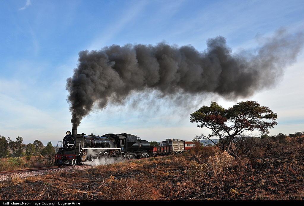 Friends of the Rail's class 19D 4-8-2 with 6-axle Vanderbilt tender, is hauling a short mixed train south of Cullinan, recreating a scene that would have been seen regularly on various branch lines around South Africa 40 or 50 years ago. The empty type DZ wagon may have brought farming equipment to the village, the silver milk wagon would have carried milk from the farms to the nearest town and the passenger coach would have provided transport for the locals.
