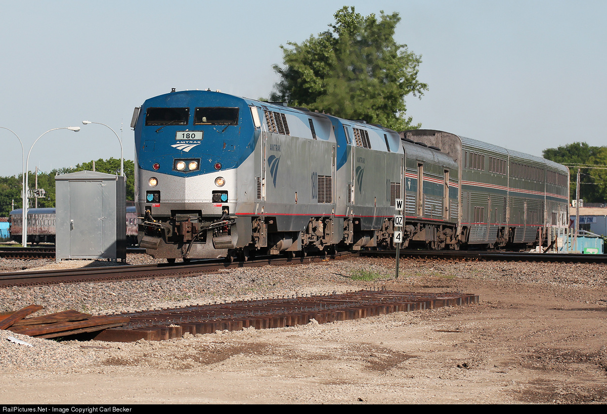 It's Friday the 13th, and it feels like it. A five hour late eastbound Empire Builder on the Prosper Sub rolls across the diamond with the KO Sub. Normally, the train would have hung a left here and headed east on the KO, but today it came straight across and headed for the Moorhead Sub. Due to a freight derailment at Elk River, MN, it will be detouring over the original Great Northern route via Breckenridge and Willmar to reach the Twin Cities. But before it can even leave town, it will have to sit on a run-around lead for a while because the crew will be dying on hours. The end of the train, three private cars, can be seen to the left of the locomotives.