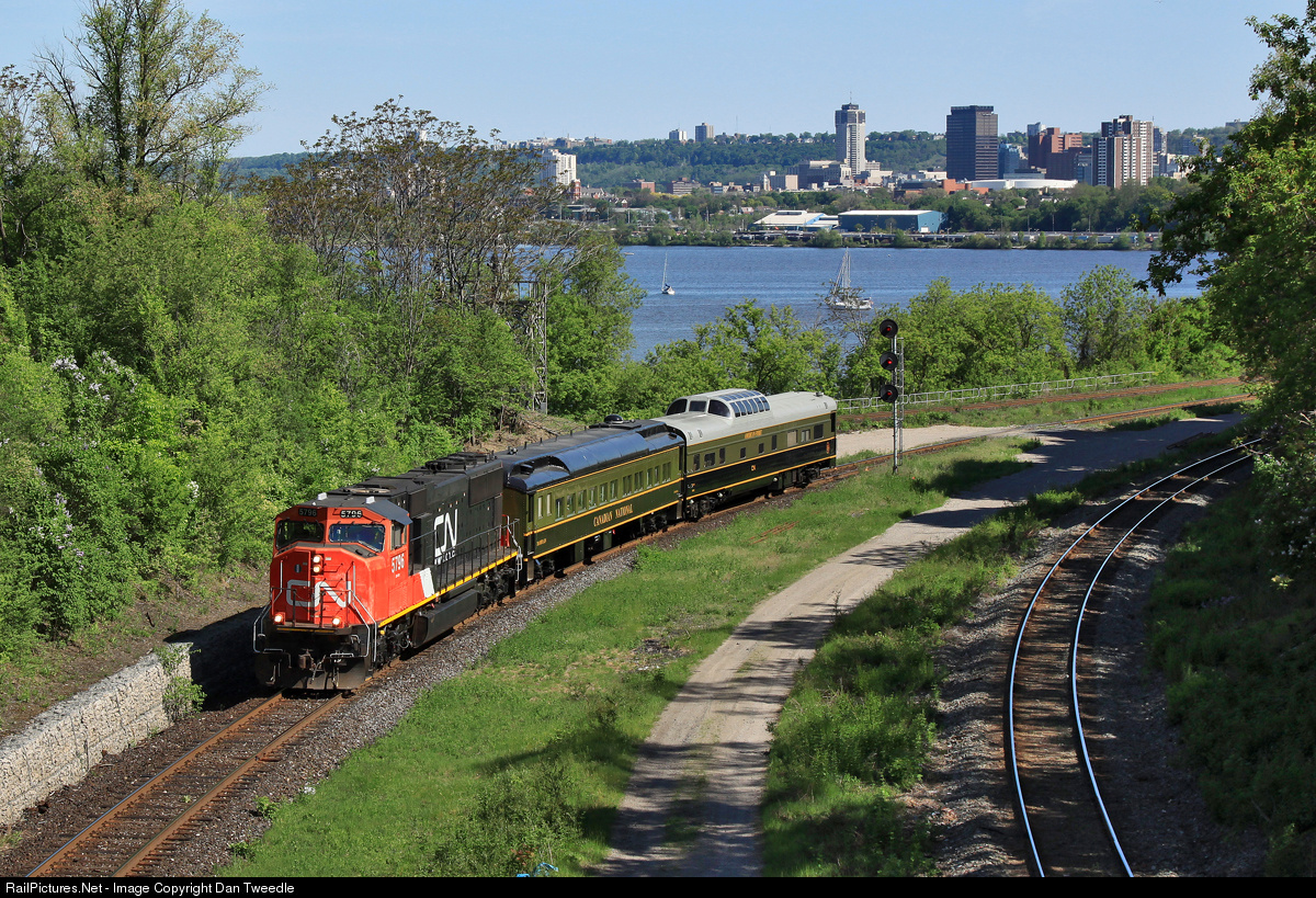 | CN 5796 creeps up the cowpath with ICMW 101314 and CN 99 in tow as train P00431 31 which carried Niagara Region mayors and CN executives along the Grimsby Subdivision from Niagara Falls to Bayview and return. The Hamilton Skyline is in the background across the bay. |