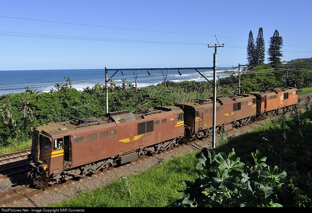 | Gone are the days! Class 6E1 locomotives, E1513 / E1540 / E1783, pass through Warner Beach on the KwaZulu Natal South Coast as they make their way back to their depot at Wentworth, in Durban. They had just dropped off a load of timber for Saiccor in Umkomaas. Sadly (for me and my friends), the Class 6E1 locomotives no longer work in KwaZulu Natal. |