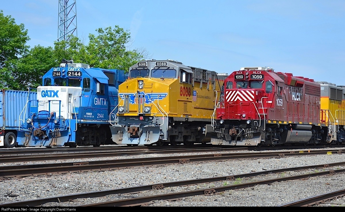 UP 8088, DPU on a northbound freight, slides at track speed between local power awaiting the call to duty in UP's tiny Russellville yard. There are 5 geeps present on this morning: 3 maroon HLCX GP38s, including a rebuilt GP40 that retains all 3 fan shrouds, a blue GMTX GP38, and a yellow UP GP60.
