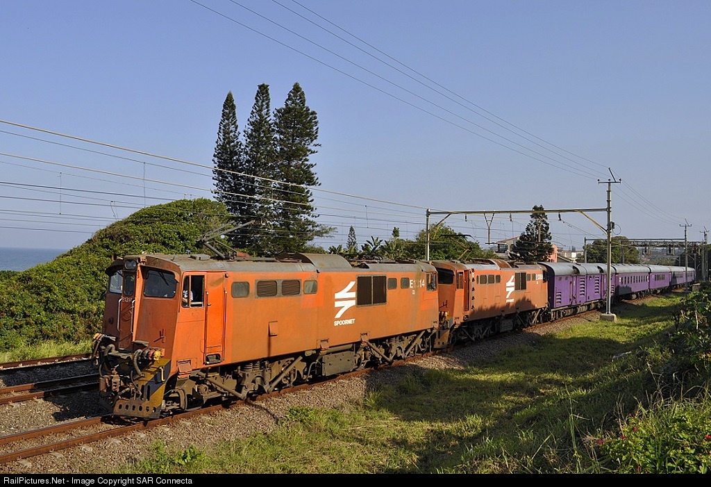 | A very rare and unusual train on the KwaZulu Natal South Coast! E1314 / E1389 (in the old Spoornet "Orange" livery) with a Tourism Indaba Premier Classe Special returning to Durban through Warner Beach. As part of the 2012 Tourism Indaba, held at the International Convention Centre in Durban, this Premier Classe set had done an early afternoon promotional and marketing trip down to Umkomaas with invited dignitaries on board. |