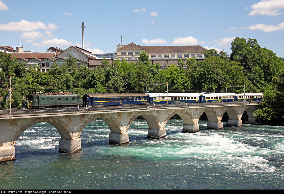 | Historic Ae 4/7 with a former dining car of CIWLT and three private cars of swiss company „Prestige Continental Express“ are crossing the bridge above the Rhine Falls. |
