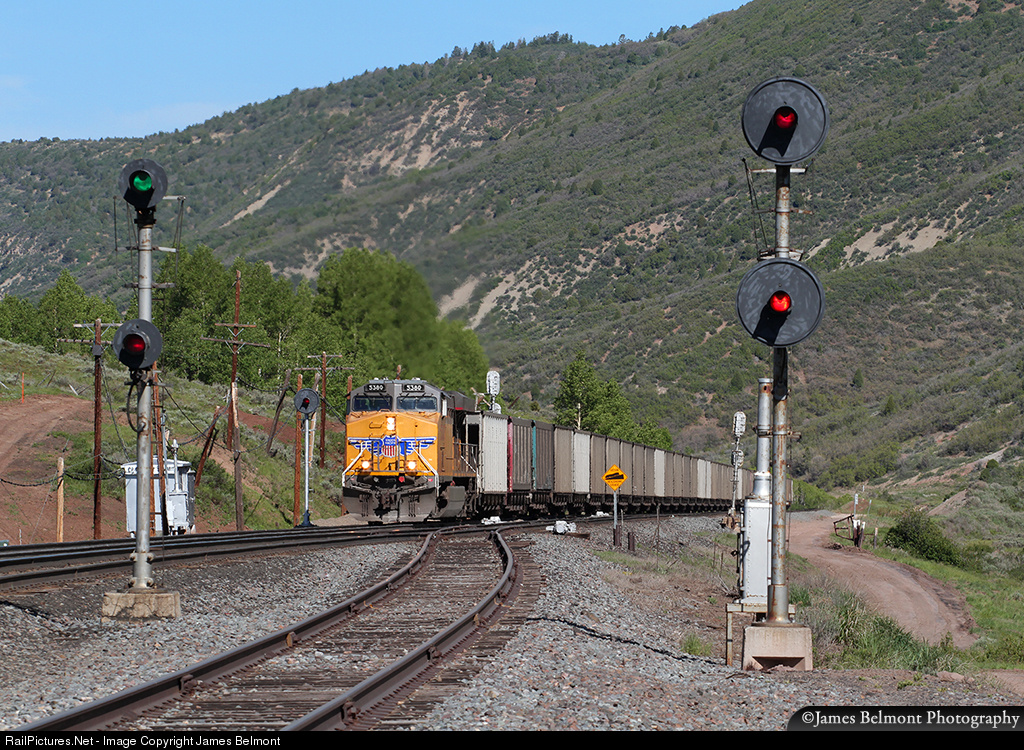 | UP's Trona to Skyline coal empty ascends the final half mile of 2% grade to the crest of 7440 ft. Soldier Summit. The old General Railway Signal 'searchlights' are on borrowed time as they are scheduled to be replaced with new tri-lights and Positive Train Control. One more icon of the old Denver & Rio Grande Western will be history. |