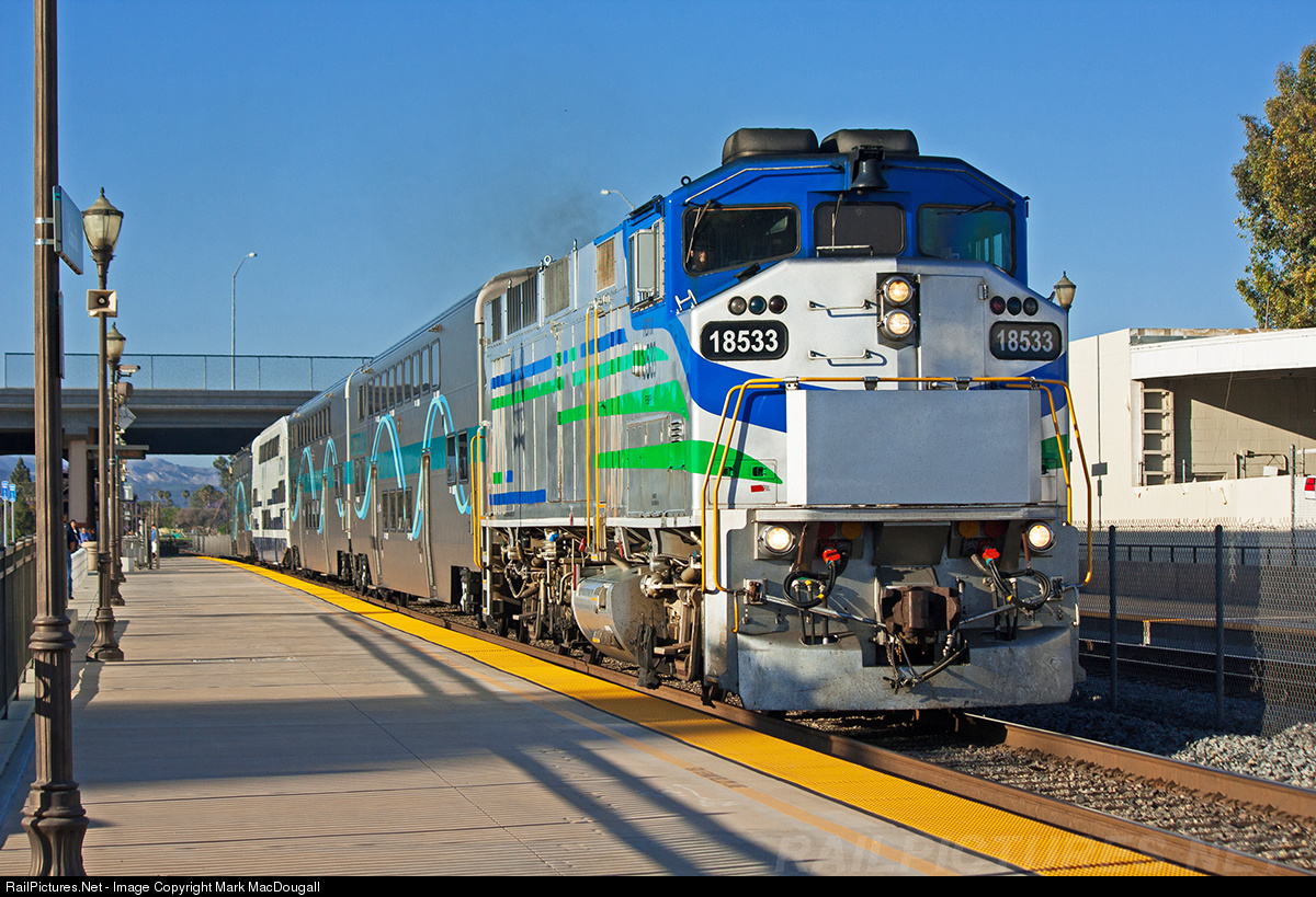 Metrolink 119 departs Camarillo behind a leased F59PH in a colorful livery.
