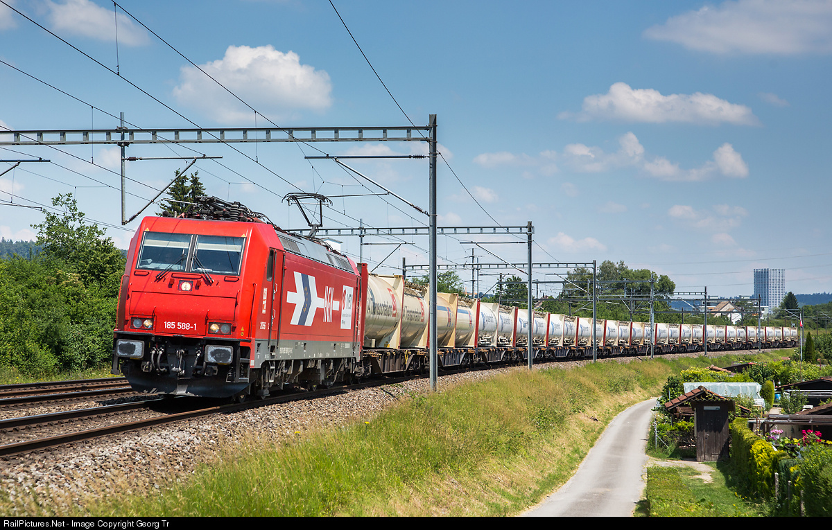 | 185 588 of the Hafen and Güterverkehr Köln (HGK) under railway "RheinCargo Gmbh" is pulling train 69840 with empty ciment containers of Dyckerhoff company from Heerbrugg to Deuna/Germany near Tössmühle, Winterthur. |