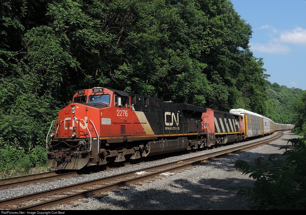 | A pair of engines from Canada continue their latest journey on CSX rails, this time on a Q253-17 autrorack train momentarily stopped here in Broadford, PA to discuss further orders. Now a few miles west of Connellsville, I'm sure the crew was happy to leave the behind the quagmire of trains that tied up Connellsville on this day. Worth noting is that the second engine was CN 2417 which is a C40-8M cowl locomotive. |