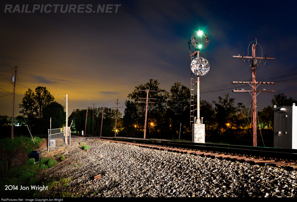 "Clear Charles Town" Protecting the CSX/NS diamond is this classic N&W CPL signal as a northbound NS train illuminates it and the right of way ahead in this 2 minute exposure.
