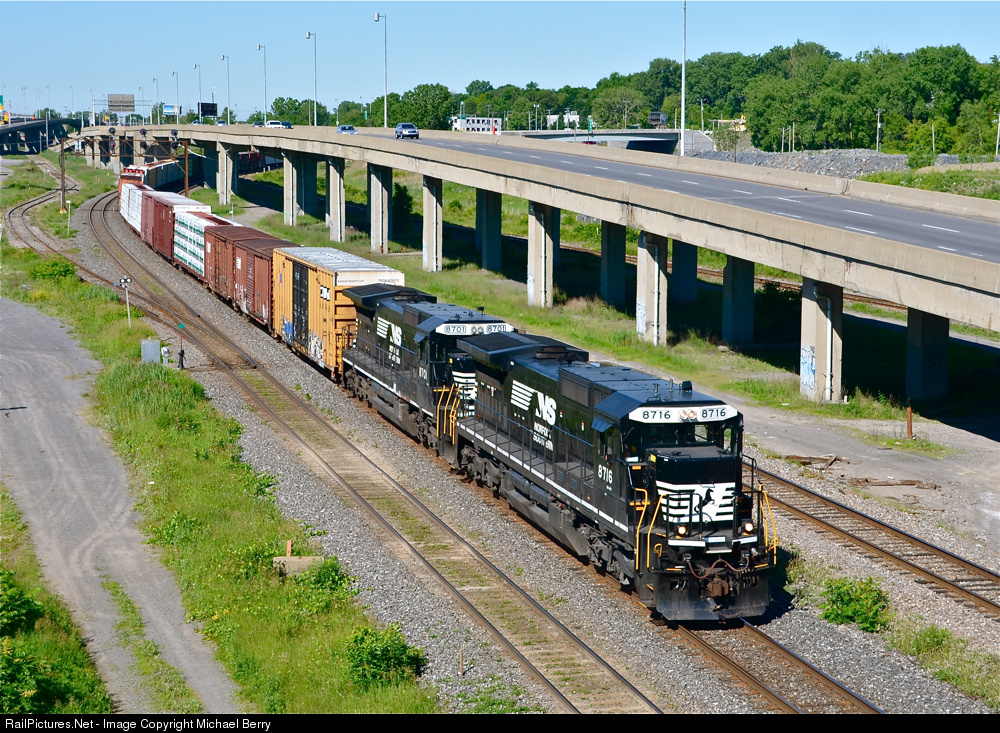 A pair of clean C40-8's. With an elephant style lashup of two standard cab GE's in great paint (NS 8716 & NS 8701), a very late CN 528 heads east through the Turcot area of Montreal. At left is the Lachine Spur, which was once CN's main line through here. It was downgraded to a spur around 1960. For a shot of the same train two weeks ago, also late, click here and here.