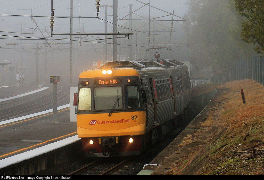 | Queensland Rail's EMU 82 arrives at Chelmer Station, Brisbane with a Bowen Hills Service on a very Foggy Morning...