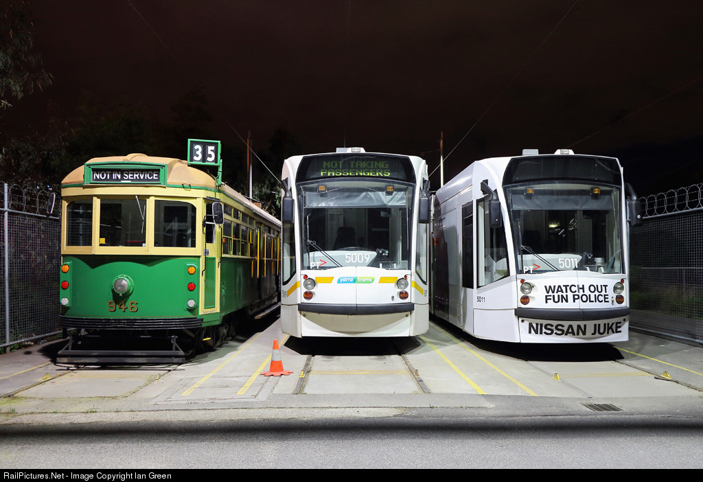 Combino trams 5011 and 5009 next to W class 946 at the west end of Southbank Depot.