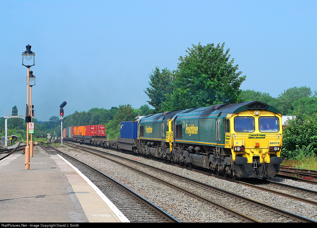 | A pair of Freightliner class 66 locos,66513 and 66541,pass through Leamington Spa station with a Leeds to Southampton working. |