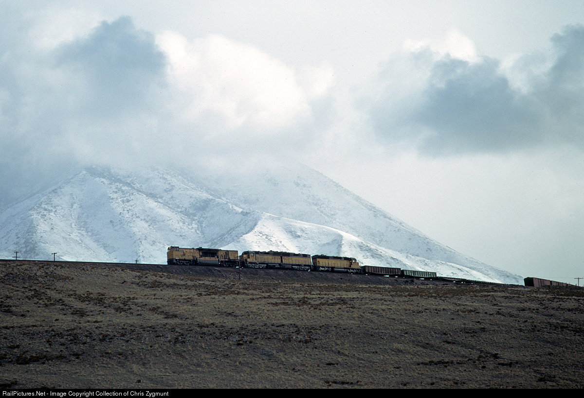 A U50C, DD35, SD5 pull a freight past a snowy mountain scene in Utah. Photo taken by Keith Ardinger.