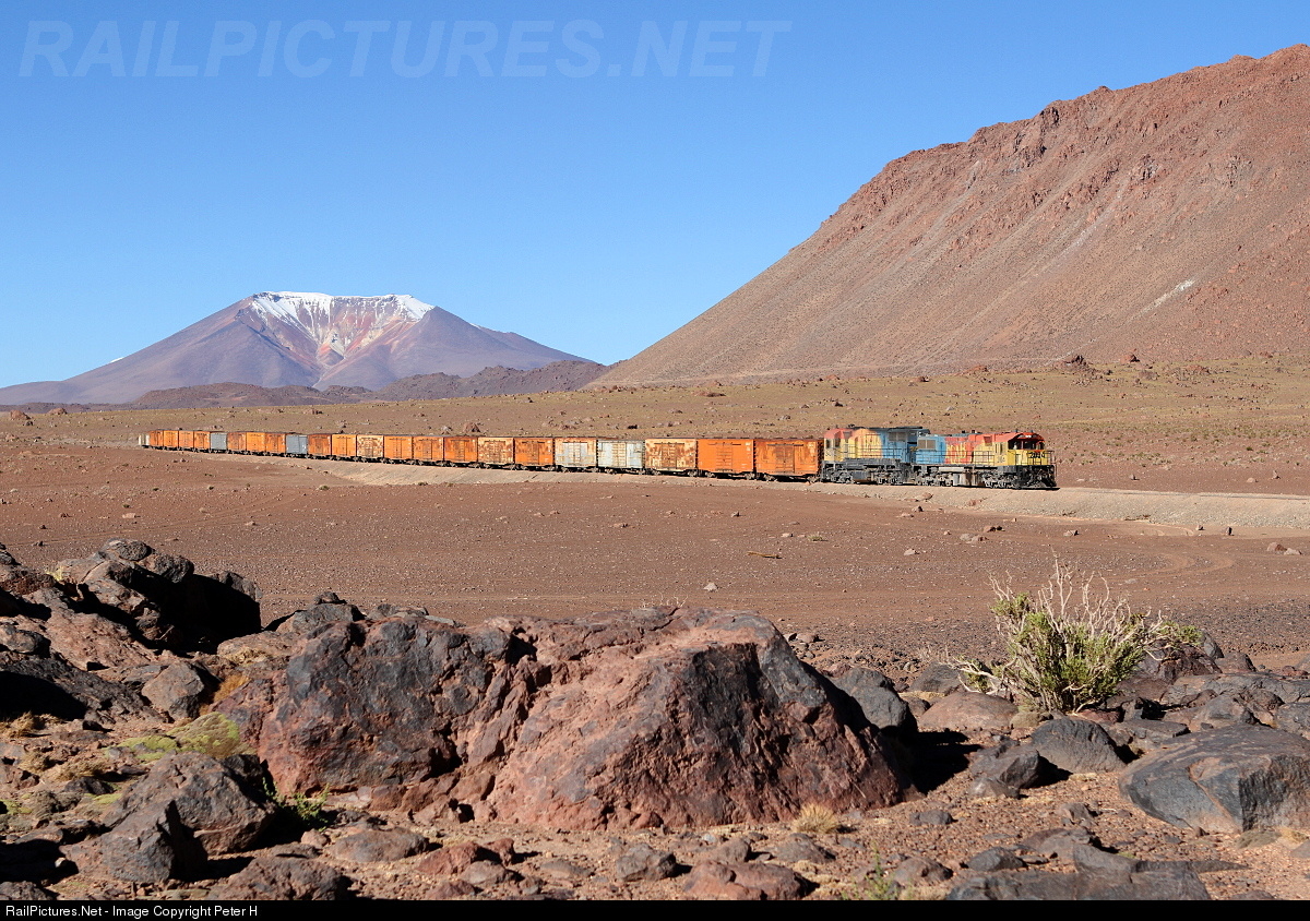 | Two immigrants on the way through the emptiness of the Ascotán pass. Clyde GL26C-2 #2004 (former Queensland Rail) and EMD GT22CU-3 @2404 (former Ferrocarriles Nacionales de Colombia) are hauling a bolivian box car train with goods down to Antofagasta on the pacific coast. On nearly 4000 m above sea level the volcano in the background reaches the 6000m limit and marks also the chilean/bolivian border. |
