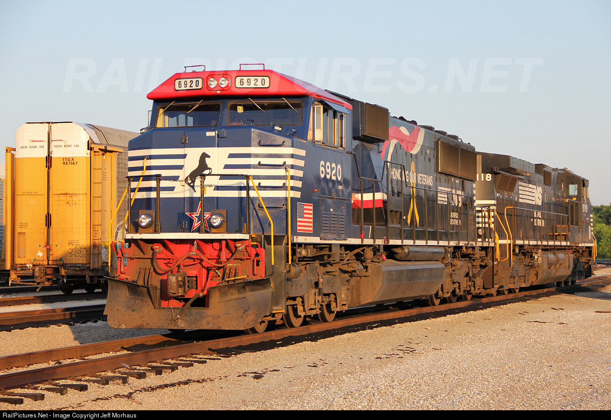 | Norfolk Southerns (Honoring Our Veterans) unit 6920 and NS 9118 sits on the ready track at Norfolk Southerns Wentzville Yard. NS 6920 originally started in Detroit as NS train 181 then after arriving into St. Louis it's name changed to D67 with a train full of parts for the GM Van and the 2015 Chevy Colorado/GMC Canyon plant in Wentzville. NS 6920 would later head back east towards Luther Yard in St. Louis as NS train D6A local. This photo was taken with permission. |