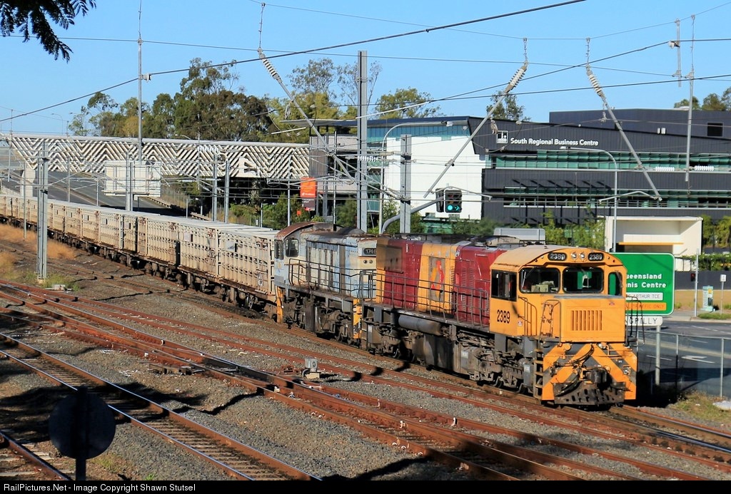 | Aurizon's 2389 and 1746 ( in Original QR Colour Scheme of Blue and Grey) trundle through Yeerongpilly, Brisbane with 6WC3, Empty Cattle Service, northwards...