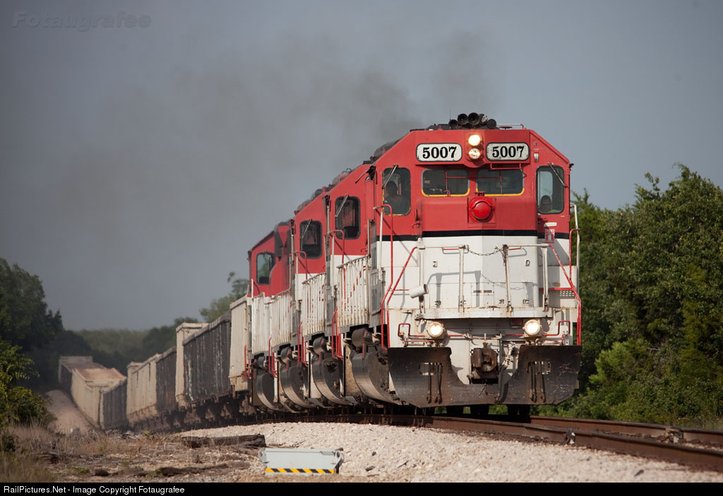 Just west of the village of Bertram, a matched 4-pack of Austin Western GP50’s lead empty rock hoppers from Oldcastle’s rock yard at Seward Junction (Liberty Hill), TX to the massive quarry at Sudduth, north of Marble Falls, TX. The camelback hills are a neat feature of railroading in Texas Hill Country.
