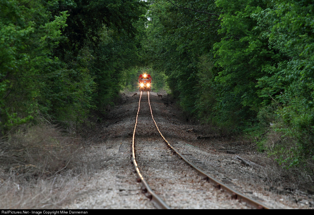 Surrounded by a dense tunnel of trees, a southbound Tennessee Southern freight slowly approaches a pair of deer grazing and frolicking along the right-of-way north of St. Joseph, Tennessee, on May 8, 2014.