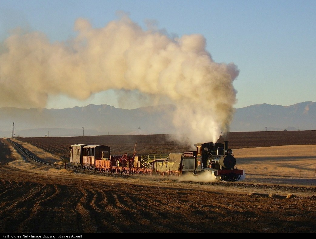 | Sandstone Estate's ex-South African Railways class NG 6 (better known as a Lawley) performs an early morning runpast for photographers. This was the Lawley's first public run after restoration. |