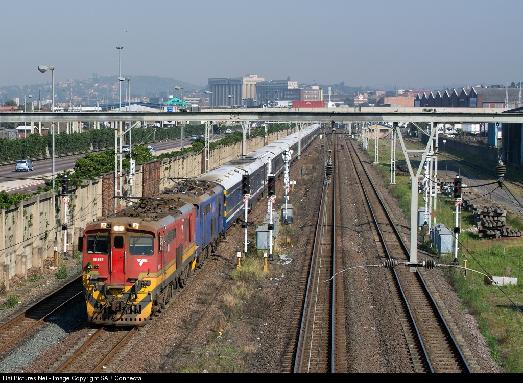 | Amid very unsettled hazy / smoggy conditions, 18-655 is about to pass under the Congella Road steel bridge with one of the luxury Blue Train sets, which is visiting Durban this weekend on a Vodacom Durban July Handicap Special (South Africa's most prestigious and famous horse race sponsored by one of the big three cell phone service providers). At the controls is senior Umbilo Depot driver and Section Manager, Mr. Chris Schutte. |