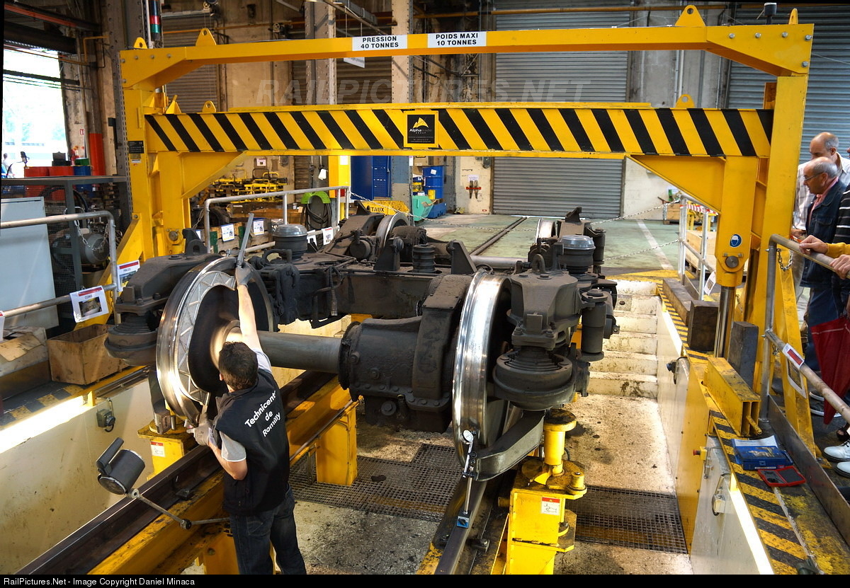 Romilly shop where this bogie of high speed train engine is in maintenance. The technician is verifies if the wheel have the correct diameter.
