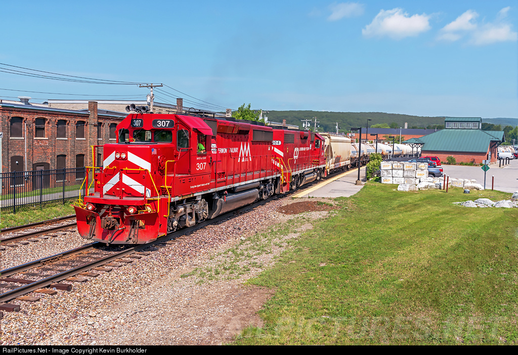 | Vermont Rail System's Clarendon & Pitsford train FLSW - the OMYA Express - heads into Rutland, Vermont, and past former Rutland Railroad buildings and the Amtrak station on July 3 with Vermont Railway GP40-2 307 and Clarendon & Pitsford GP38 204 with 37 loaded OMYA cars. |
