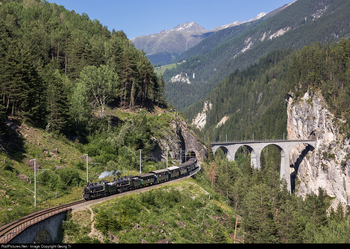 Doublehearder steamtrain of the Rhätische Bahn on the occasion of 125 years railway in Grison, with the two "Consolidations" G 4/5 # 107 and 108, on the return journey from Samedan to Landquart. A few moments ago, the train left 216 meter long Landwasser tunnel, crossed the 65 meter high and 112 meter long world famous Landwasser viaduct and run through the only 27 meter long Zalaint tunnel and is about to cross the 120 meter long Schmittnertobel viaduct.