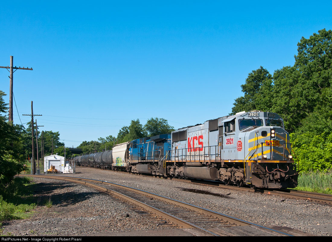 | KCS units occasionally visit New Jersey on crude oil trains and less often on ethanol trains. This empty ethanol train is being pulled out of the Motiva refinery behind KCS 3921 and CEFX 1035 on a beautiful summer morning. It will eventually receive a CSX crew for the return westbound trip. |