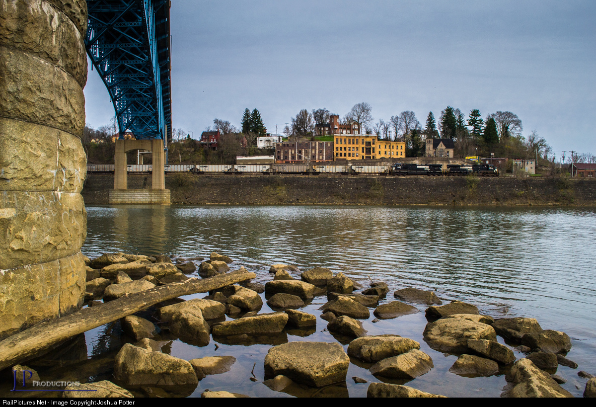 Norfolk Southern 9373 leads an empty N10 south on the Loveridge Secondary to its namesake coal mine in West Virginia. N10 has just passed under the Rt. 40 National Pike bridge over the Monongahela River. The locomotives are also about to pass the building that once housed the station for the Monongahela Railway, which is now just a vacant shell.