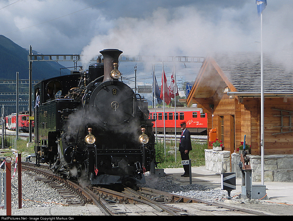 | Steamloc BFD 9 'Gletschhorn' (former Brig-Furka-Disentis-Bahn), built 1914, in the station Oberwald. On the right side the nice 'station building'. The red trains in the background are from the MGB (Matterhorn Gotthard Bahn) |