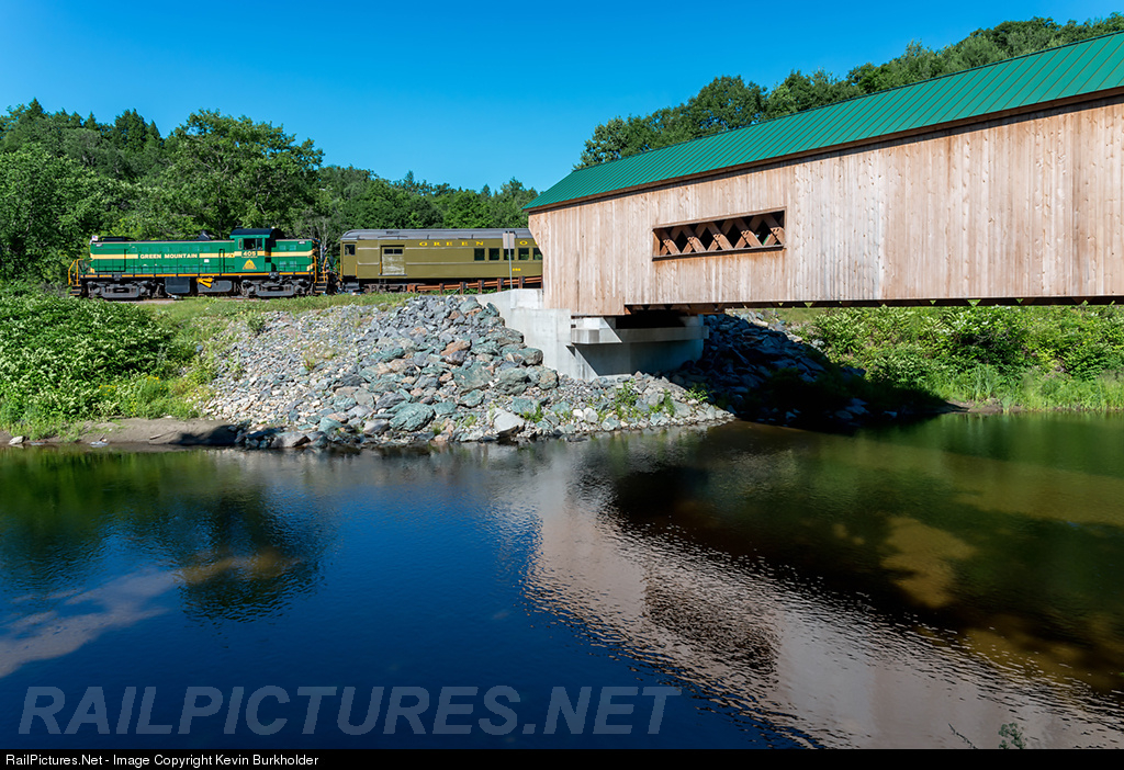 | A series of July 5 'practice trips' were operated on the Green Mountain Railroad's Bellows Falls Subdivision in anticipation of Fall Foliage trips later this year on the same schedule. The trips were operated with the GMRC Alco RS-1 405 and seen here passing the rebuilt Bartonsville covered bridge. Vantage point for this shot is with home-owner's permission. |