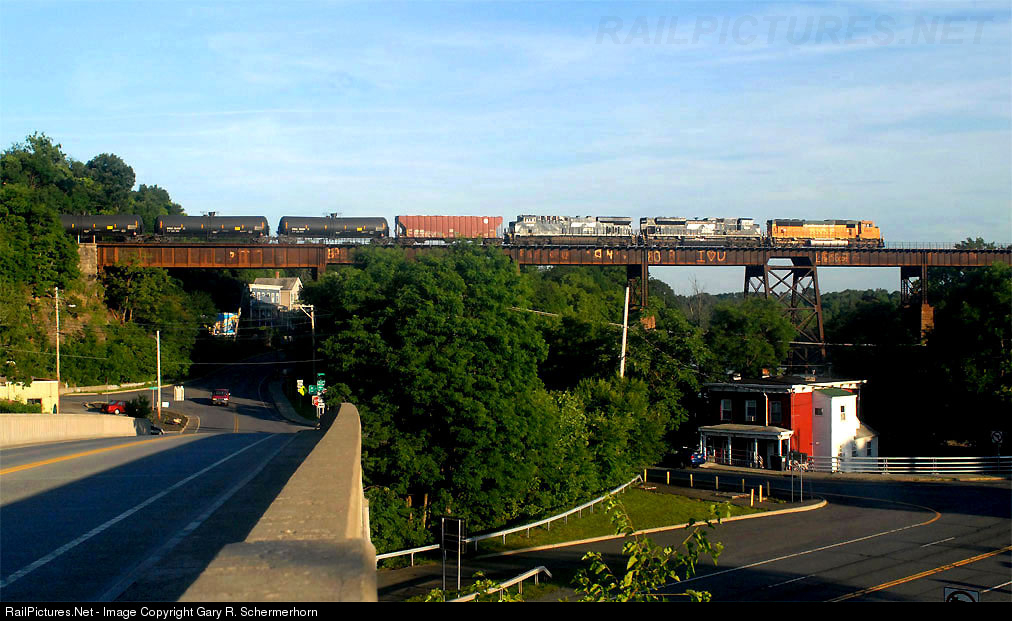 | Late evening light glints off the BNSF & NS power of a southbound "K" oil as it rumbles over the Catskill Creek on the heels of a Q156. The loaded oil is part of a four train parade out of Selkirk held at Ravena for MOW to clear up on a very slow Sunday on the River Sub.
