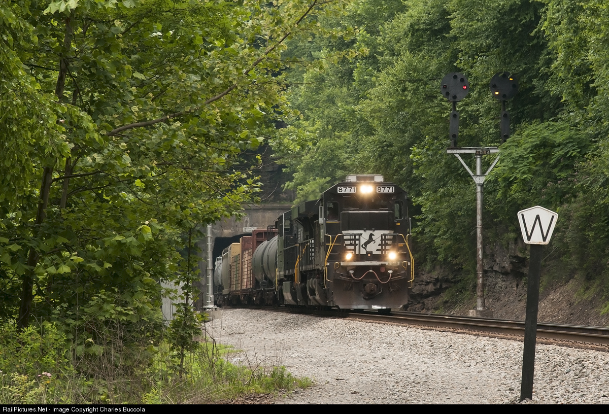 | A Norfolk Southern general merchandise train led by C40-9 #8771 exits the westernmost of the two tunnels at Twin Branch, WV. The CPL signals continue to steadfastly perform their duties. |