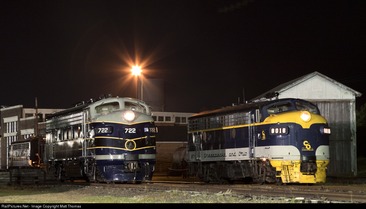 Potomac Eagles B&O F7A (ex Bessemer and Lake 722 built in 1952) sits next to Potomac Eagles C&O F3au (formerly Clinchfield # 800 and later CSX 116 built in 1949) pose for some night shots at Spencer.