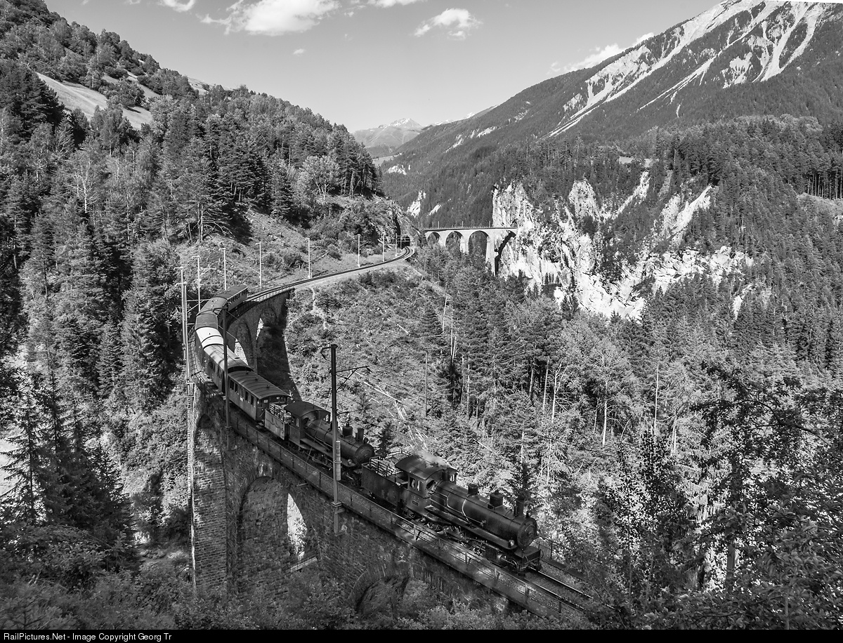 | The two "Consolidations" G 4/5 # 107 and 108 of the RhB with the doubleheader on the occasion of 125 years railway in Grison, on the return journey from Samedan over the Albula line to Landquart, crossing Schmittentobel viaduct with Landwasser viaduct in the background. |