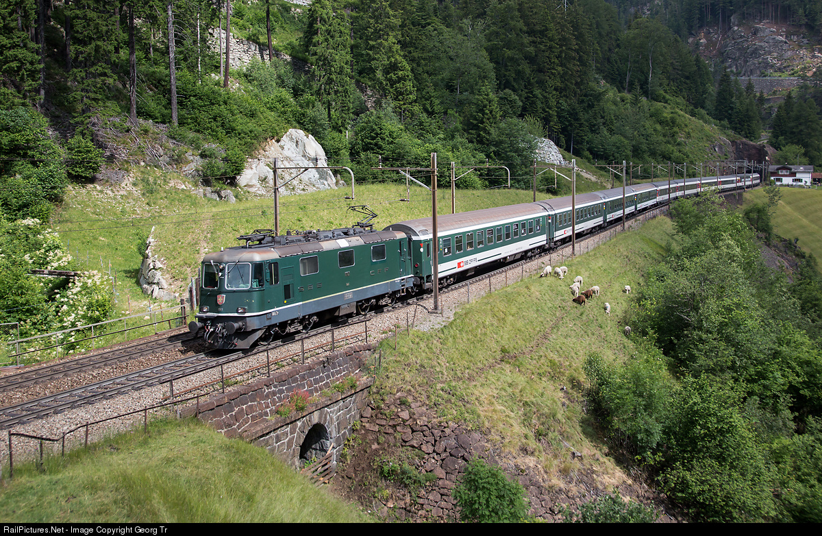 | The last and only green Re 4/4 II of the passenger department, # 11161, is pulling Interregio 2165 Basel-Locarno on the uppermost level of the loops of Wassen, with several older supplementary cars of type "B 21-73" behind the locomotive. |
