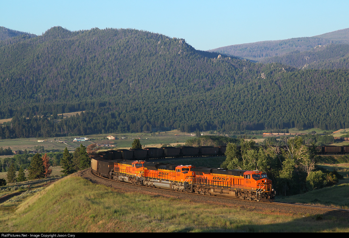 BNSF6674 lifts a westbound coal train around the horseshoe curve at Iron Ridge. The sun has just broke over the Ridge at 6:28AM. Note the Rear help above the headend power leaving Austin siding. The swing help is out of sight behind the trees... This photo was taken with permission from the landowners.....