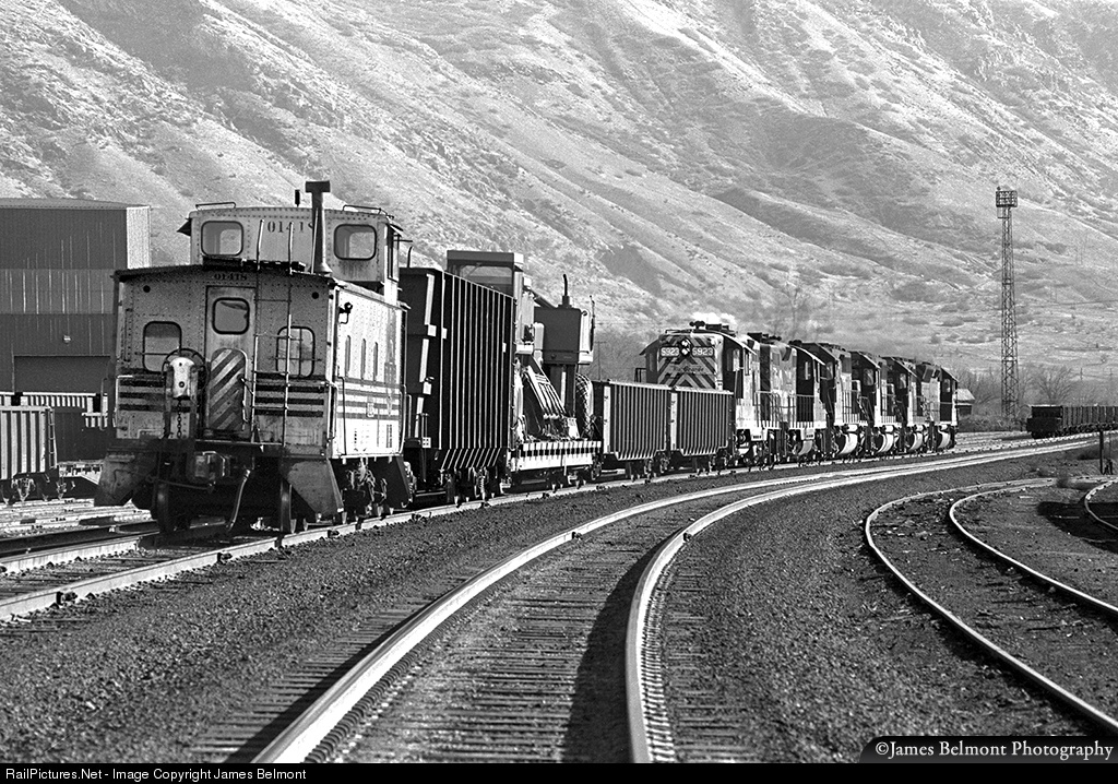 Rio Grande's Salina Local slows to make a pickup at Provo Yard on Dec. 26, 1976. Caboose 01418 has been preserved at Utah's Heber Valley Railroad.