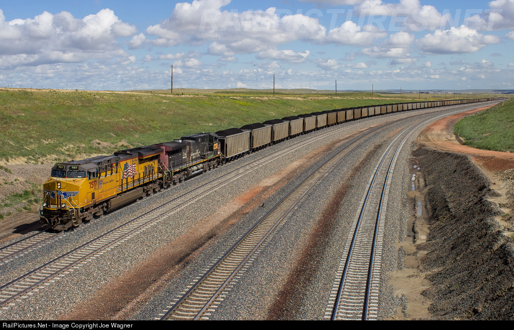 Having just been loaded at the Antelope Mine, a southbound loaded UP coal train fights and claws its way up the 1% grade of Logan Hill north of Bill, WY. This train is headed for unloading at the Electric Energy Inc power plant located in Joppa, Illinois, the very southern tip of the state.