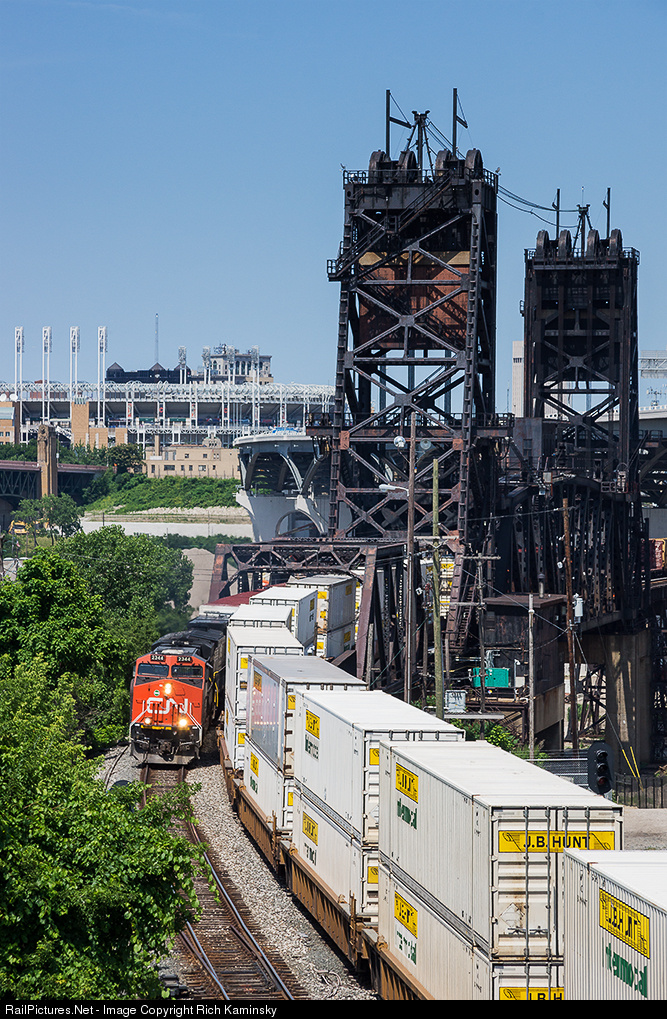 NS 145 with a CN leader meets eastbound NS 206 at the former NKP drawbridge over the Cuyahoga River with Progressive Field in the background