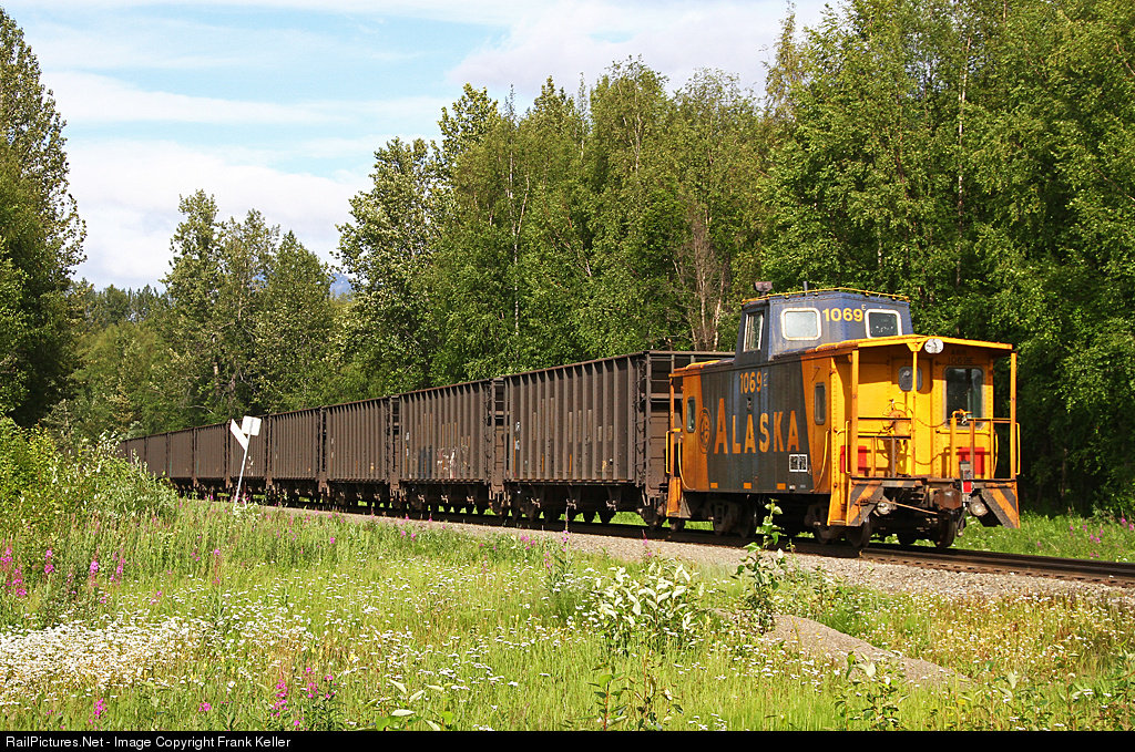 | In another development on the Alaska Railroad it looks as if the railroad has returned a caboose to service on one of the roads gravel trains. Due to change in operating procedure the AS&G gravel train now runs with a caboose to protect the reverse movement up the Palmer Branch, seen here at Birchwood. |