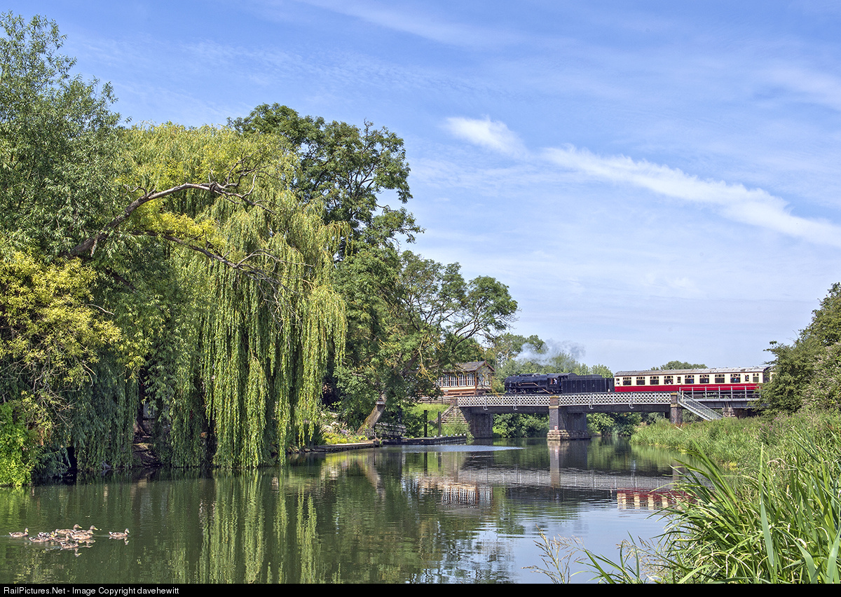 S160 locomotive , built in the USA, is a loan engine on the Nene Valley railway at present. Seen here with first train of the day heading into Wansford station, crossing the river Nene