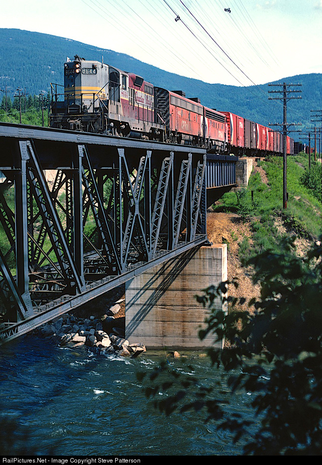 With first generation power CP 8644 West is headed from Nelson to Castlegar at Shoreacres, B.C. on June 12, 1975. Kids have tied their swing rope on the lower girders.